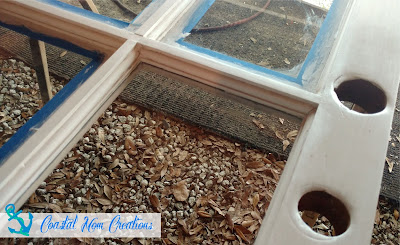 The window panes were scraped at the edges to remove any old paint and then taped off. Two coats of Antique White chalk paint were applied.